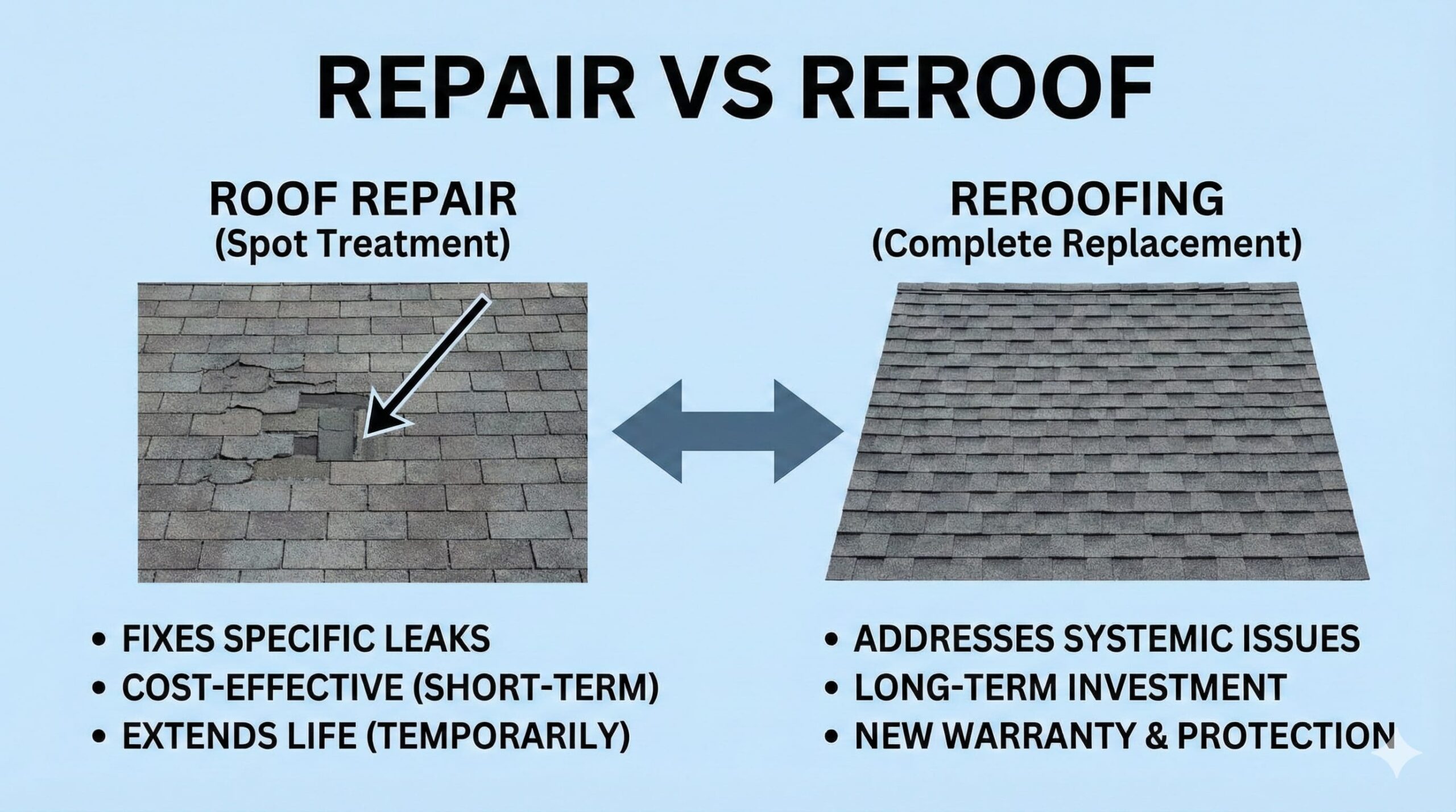 If leaks are isolated, repairs may be fine. If the roof is older or deteriorated in multiple areas, reroofing is more reliable.