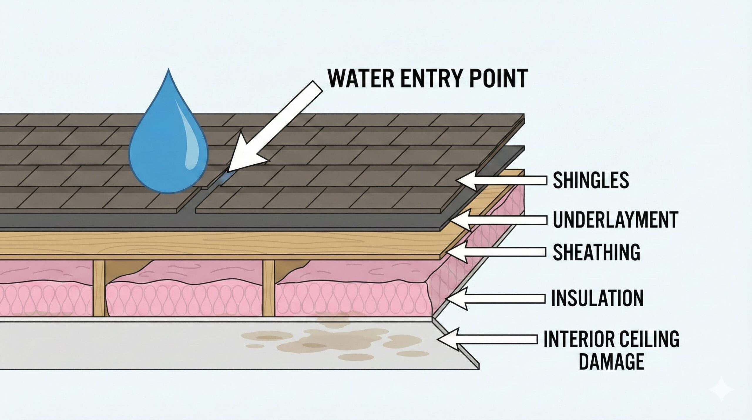 Common leak sources include chimney flashing, skylights, valleys, wall transitions, broken tiles, lifted shingles, and deteriorated underlayment.