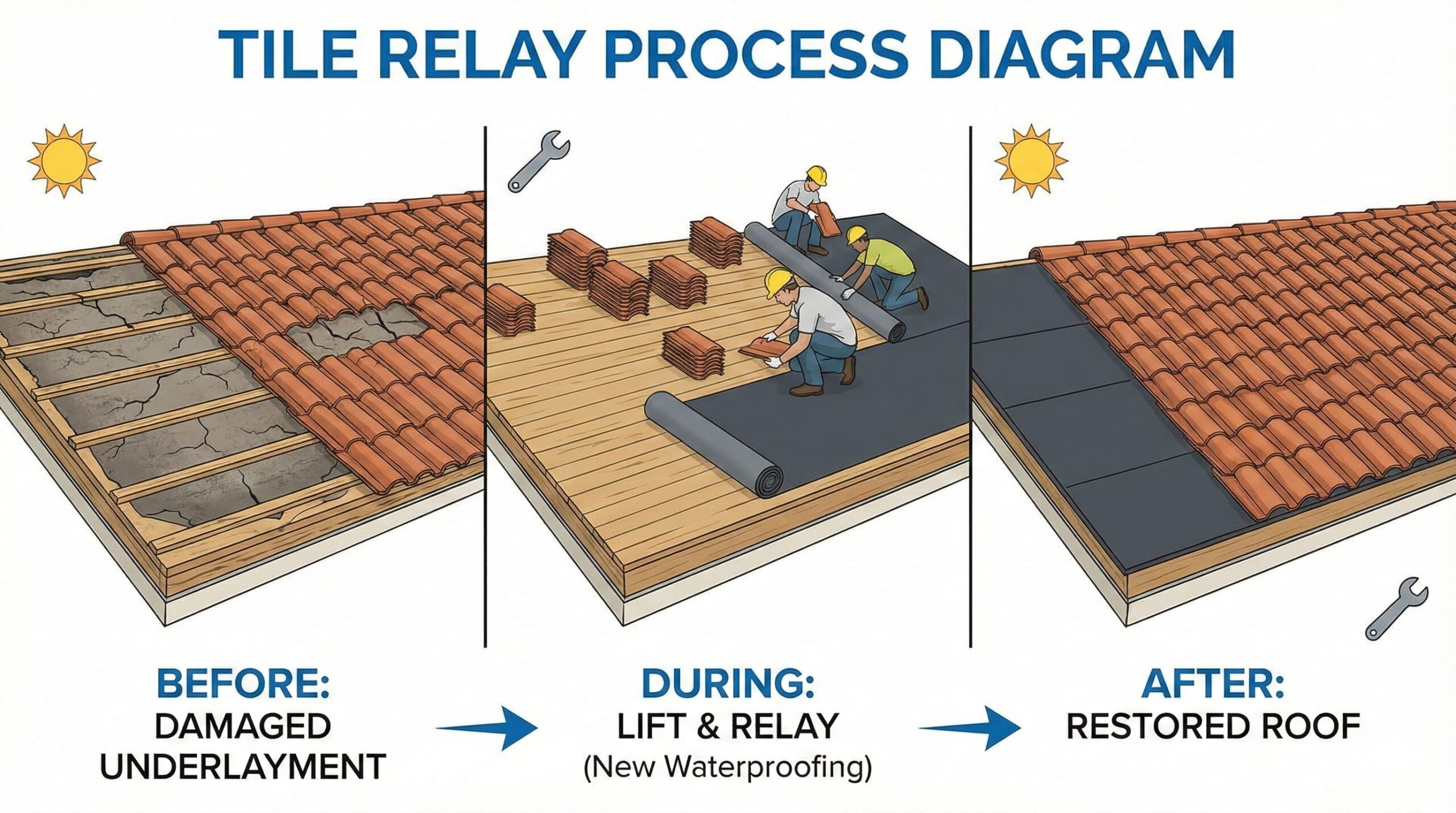 A tile relay removes tiles, replaces the underlayment, fixes dry rot or flashings, and reinstalls tiles. Tiles are reusable; underlayment is not.